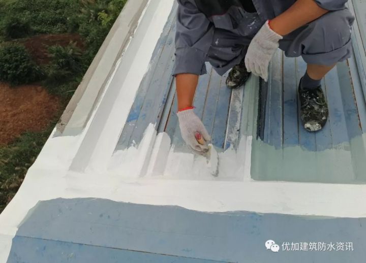 屋脊接缝、垂直搭接、水平搭接、螺钉、突出屋面设备等防水薄弱区域,极易漏水,所以在金属屋面漏水范围内的所有接缝,需采用金属屋面高弹防水涂料进行“三涂一布”防水施工。